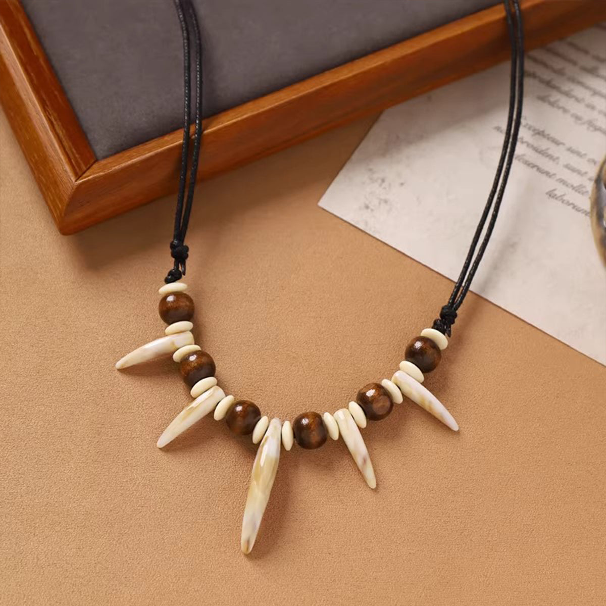Handwoven Wolf Tooth Wood Bead Necklace - Tribal Ethnic Unisex Retro Sweater Chain, Perfect for Bold & Unique Looks