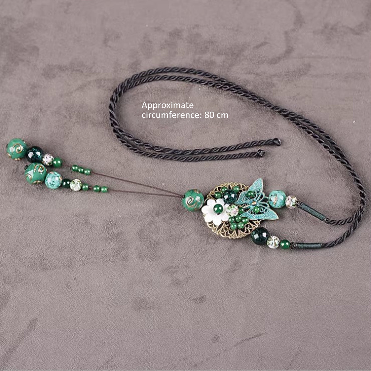 Featuring a premium long sweater chain accented with a jade-inspired stone and glass pendant, this necklace blends earthy tones with luminous shine. Its retro ethnic sensibility brings depth and character to your wardrobe, while the glass element adds an eye-catching highlight that moves beautifully with every step.