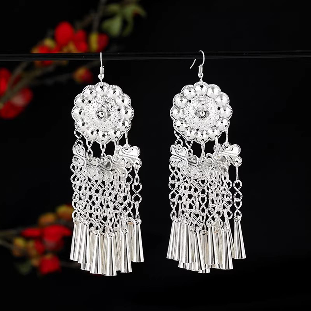 Inspired by traditional Miao silver craftsmanship, these long dangle earrings feature cascading tassels and delicate bell accents that sway with your every turn. Their bold silhouette and dynamic presence make them perfect for dance, special occasions, festival wear, or any outfit that calls for cultural flair and visual impact.